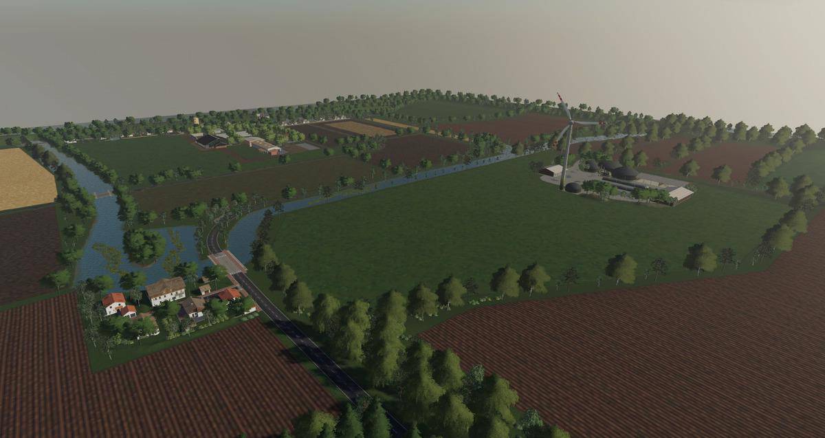 It is a large map with 16.7 square kilometers as usual, it offers 228 arable areas where grassland is already included through the field missions, plus several forest areas, biogas plants and 9 flat farm plates (a total of 255 buyable areas)
