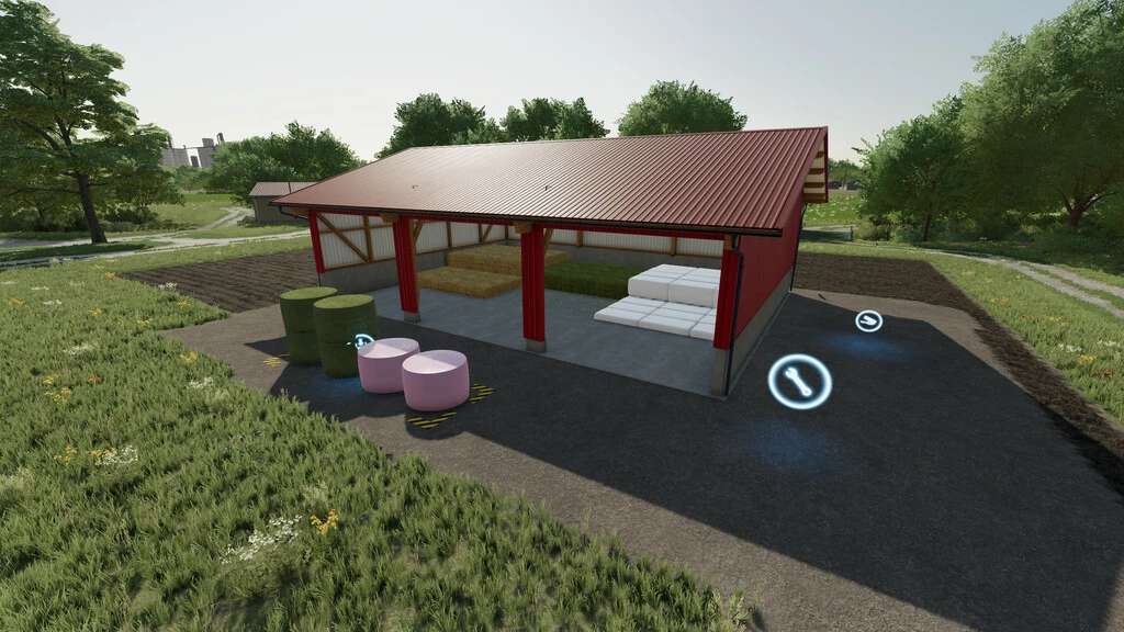 Bales or lose crops can go in and bales of all sizes, loose crops, both round, and square will be spawned in front of the barn. There are 3 versions to choose from. Barns are color changeable and have built-in lighting. If the bale storage is empty, it can still be used as a barn or shed!