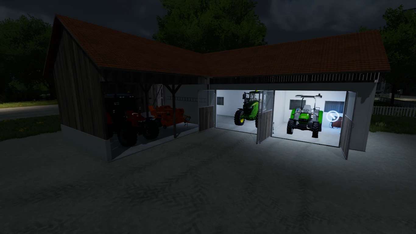 I am sharing the mod with the small garage and store kit. The doors open, it has sounds, it has lights, you can put a vehicle, bale or wheat in it, or you can go to the right side and put the vehicle in it (it is also active on the outside) and you can change the parts.