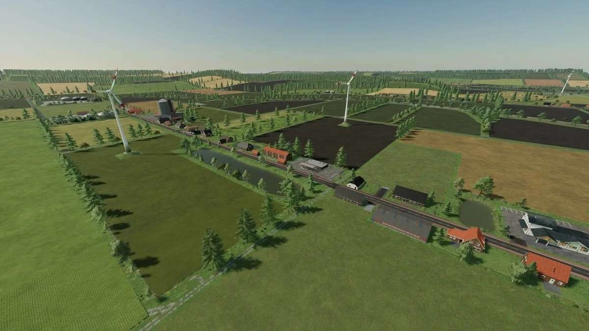 There are 180 fields, 17 flat areas where you can build your farms, plus 8 biogas plants with a decent bunker capacity, 31 forest areas that can be bought.