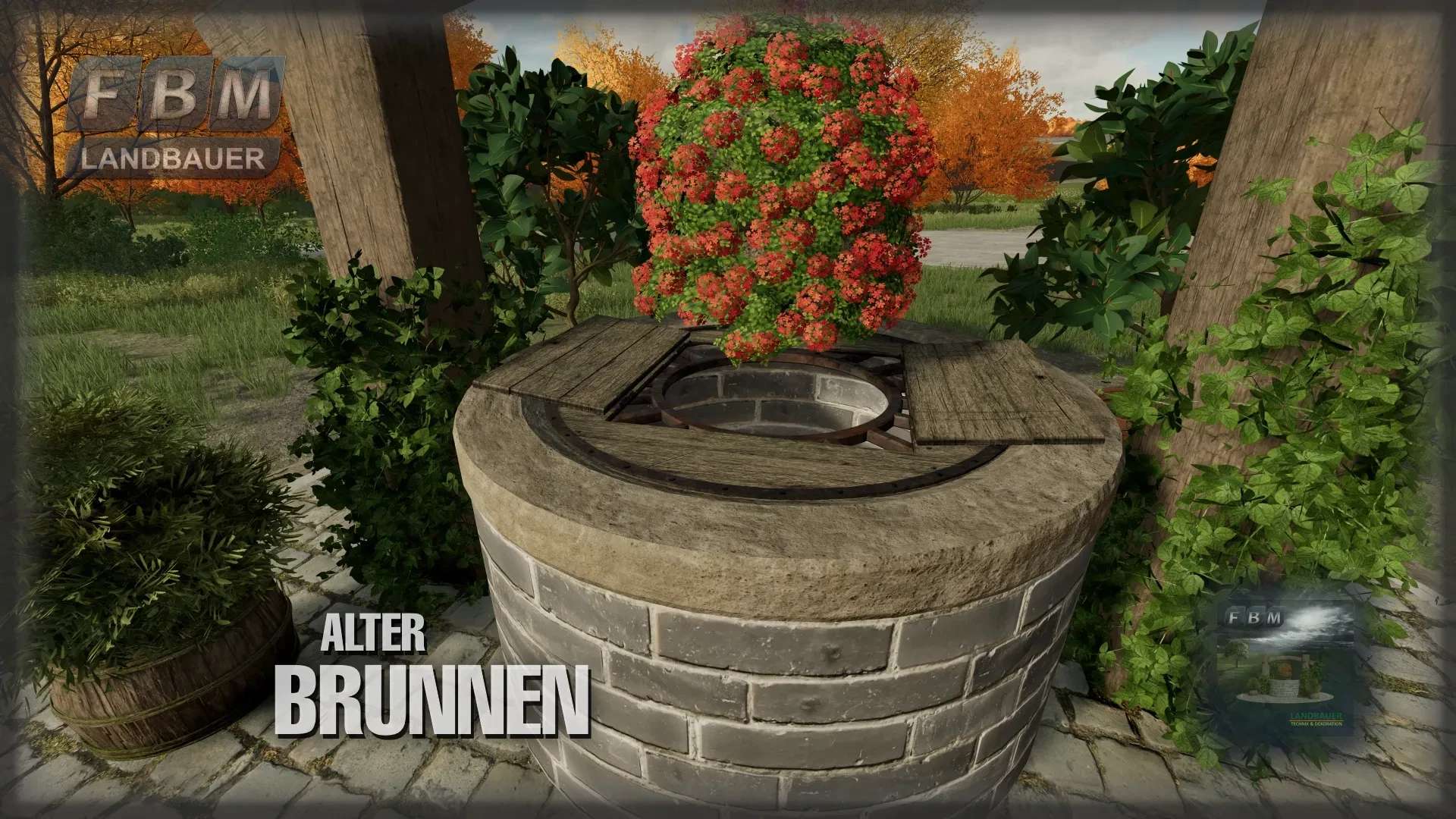 A restored old fountain with lots of plants as a decorative eye-catcher for the courtyard or village square. The plants are seasonal or can only be seen at certain times of the year. The fountain itself has two small wooden doors on the cover plate that can be opened to fill the fountain with water. The flower color can be selected.