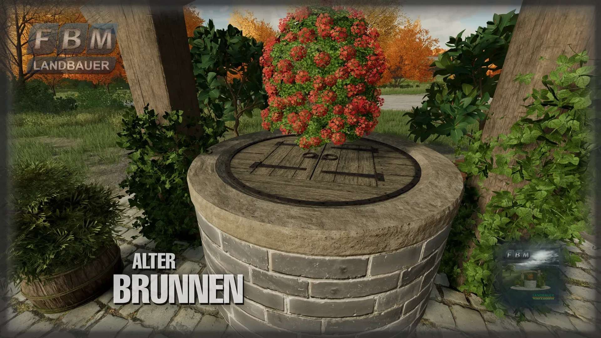 A restored old fountain with lots of plants as a decorative eye-catcher for the courtyard or village square. The plants are seasonal or can only be seen at certain times of the year. The fountain itself has two small wooden doors on the cover plate that can be opened to fill the fountain with water. The flower color can be selected.
