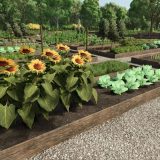 All gardens come in four variants, each with and without a fence and with and without wooden garden beds.