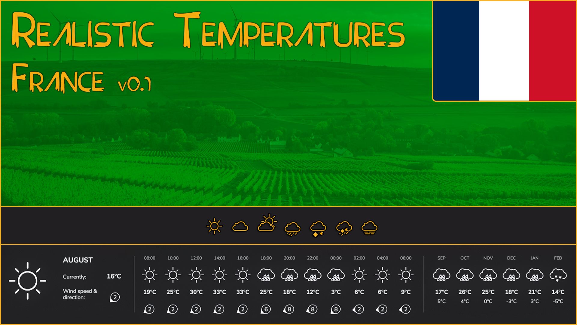 I bring you Realistic Temperatures – France, the seventeenth of a series of scripts for FS25 that will allow for more realistic and varied temperatures depending on the region you are playing. This mod also allows for rain/snow/hail to happen in more seasons, region dependent.