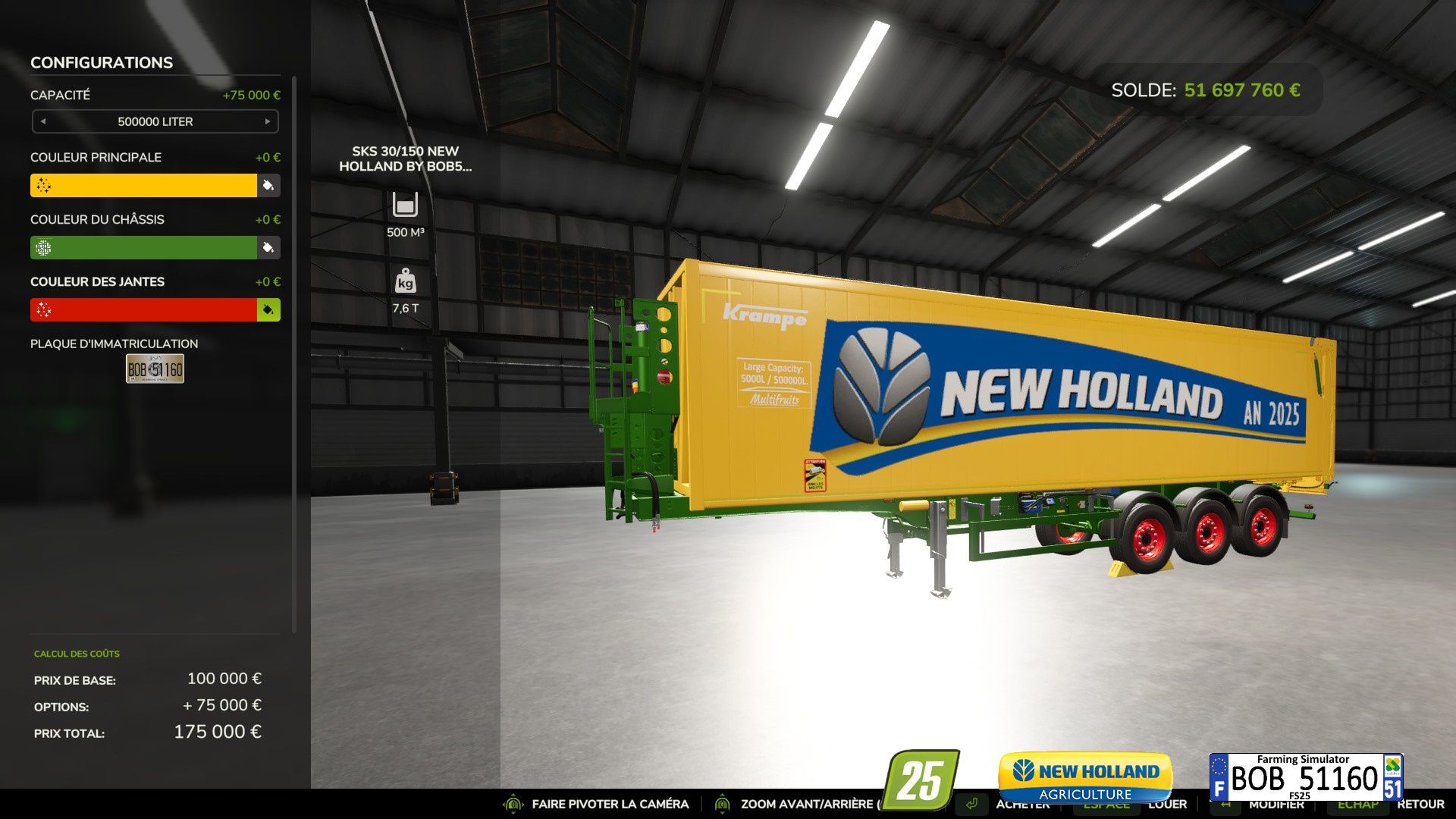 Hello everyone today I am posting the mod for FS25, the Sks 30 150 New Holland Trailer By BOB51160, in options choice of color of the body, the chassis and the rims, there are also decorations like 1 fire extinguisher, there is also 2 rotating lights in operation and you also have the choice of 10 load capacities between 50000L to 500000L, for more information see the attached photos thank you and good luck to all and I wish everyone a Happy New Year 2025……BOB51160.