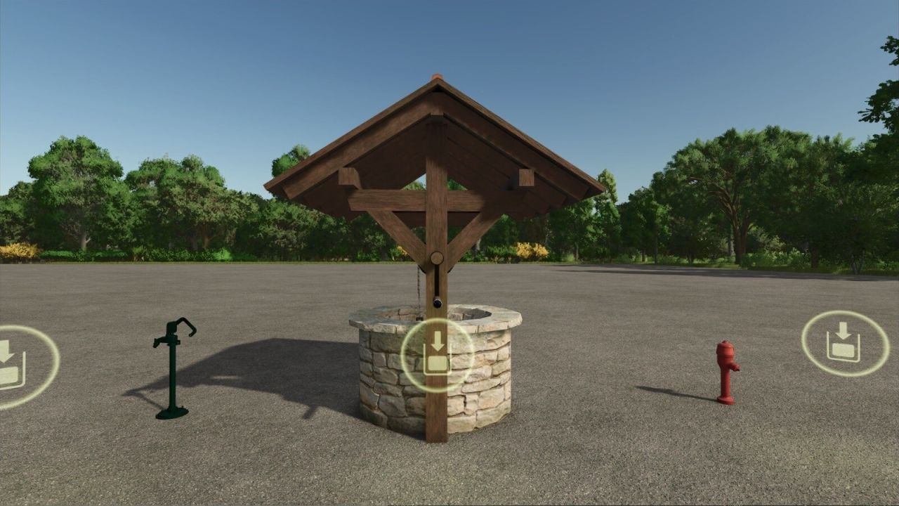 Water pack with a stone well, a small garden pump and a fire hydrant. You get free water.