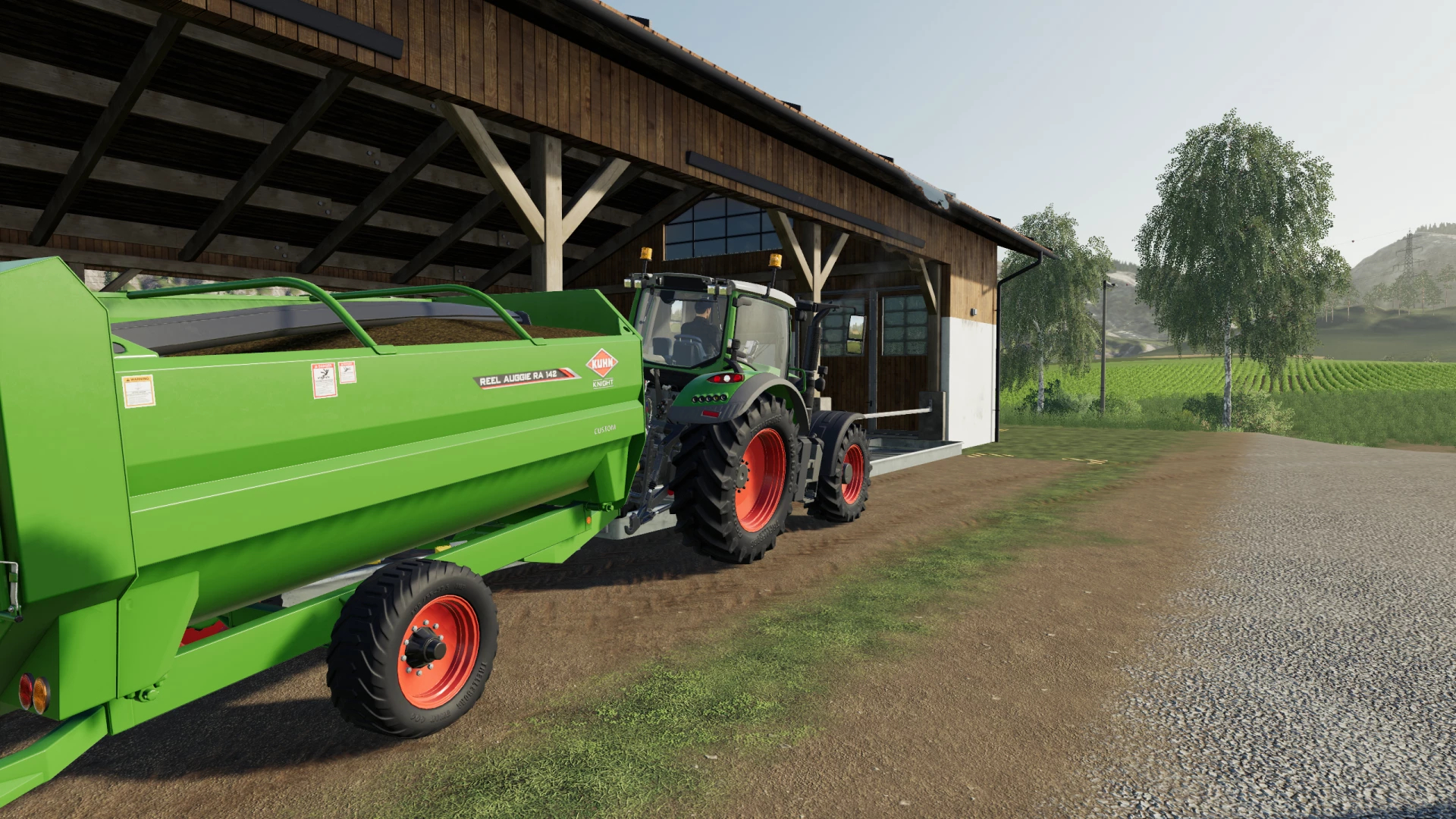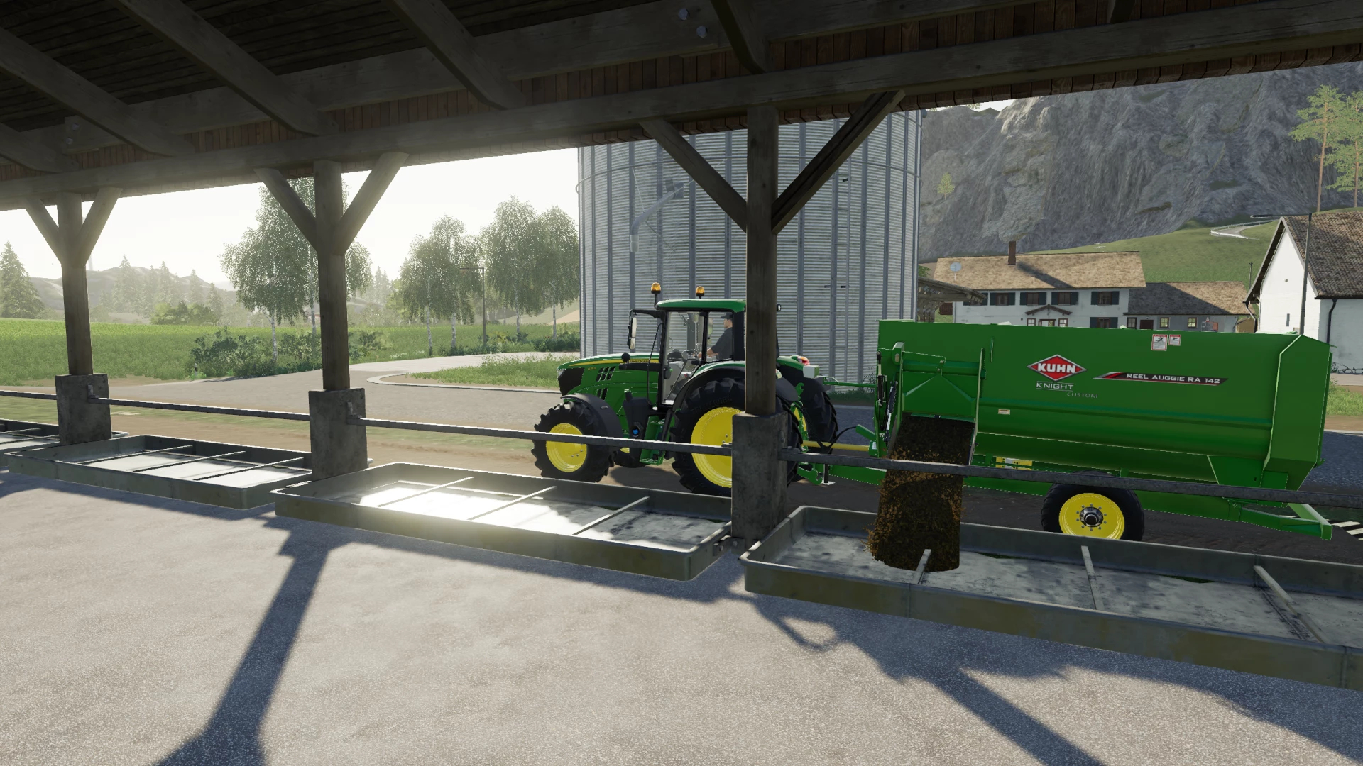 This modified version of the Kuhn Ra 142 makes life just a little easier when mixing your cattle feed. The capacity and mixing ratios have both been tweaked slightly so that now you can fill the base game (940 litre) bucket five times with silage, and then use a straw and hay bale with no waste. Mixing with three bales works fine to. Furthermore, the main body and rims are color select-able and you have a choice between stock and wide tires.