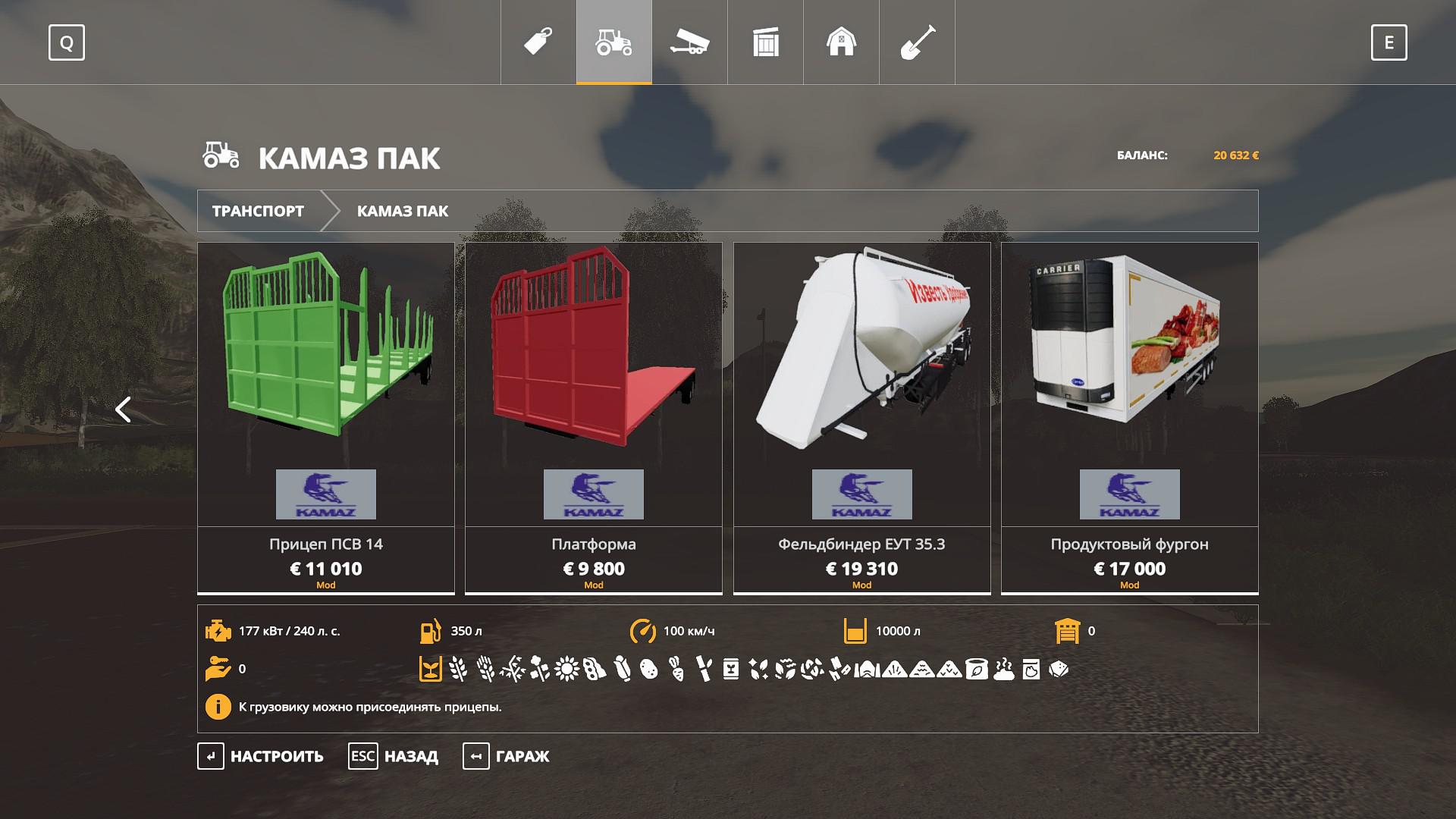 Pack includes: – KamAZ-65117 grain carrier; – Trailer grain; – KamAZ-43118 timber carrier; – Trailer timber; – KamAZ-54115 tractor; – Semitrailer grain; – Semi-trailer timber; – Semi-trailer platform; – Food semi-trailer; – KamAZ-53215 barrel; – Barrel trailer; – KamAZ-55111 dump truck; – KamAZ-6520 dump truck; – KamAZ-53215 onboard; – Nefaz-8560 trailer; – Tank wagon; – Feldbinder EUT 35.3.