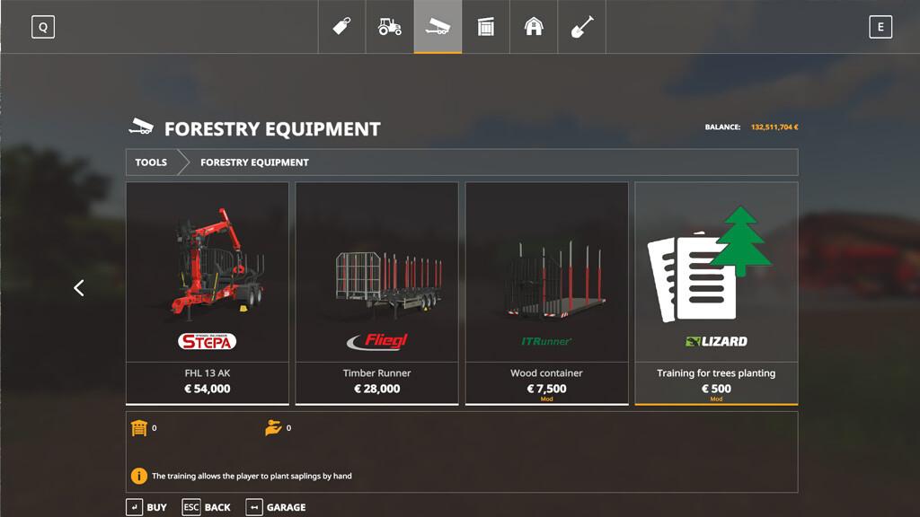 This mod adds training for planting trees in the shop under forestry equipment. When purchasing the training, a hand tool is added to the player. This makes it possible to plant saplings by hand. The selection of the hand tool works the same as with the chainsaw with mouse wheel or key 1 / 2. The sapling is set when the key is released. It usually takes a while for the sapling to grow to the tree.