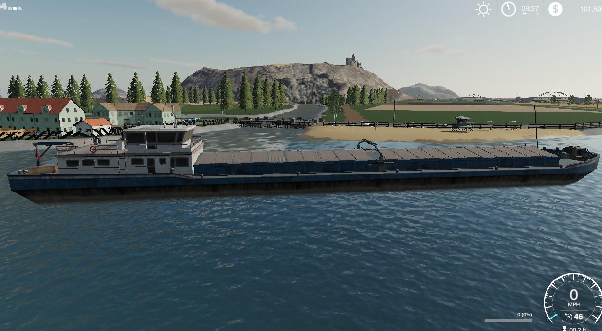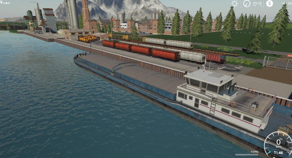 Map contains the following: 2 trains; 1 barge; 59 fields; 2 BGA’s; 3 forests: 16 custom sell points: 21 water fill triggers; 133 farmlands to purchase; working traffic and pedestrians; Standard fruits plus Sorghum, Millet, Rice, hemp, Coffee, Cranberry, Hops, Carrot, Onion, poppy, Mustard, Peanut, Rye, and Clover.; Product to mine containing a few hundred million liters each of the following material: Coal, Salt, Gravel, Ore, and Sand.